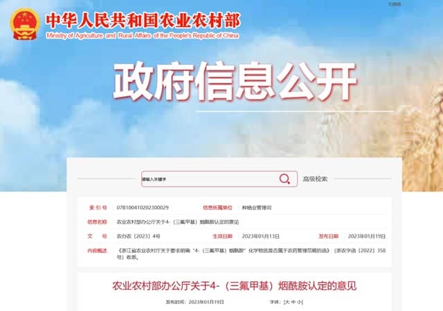 農(nóng)業(yè)農(nóng)村部公布的《浙江省農(nóng)業(yè)農(nóng)村廳關(guān)于要求明確“4-(三氟甲基)煙酰胺”化學(xué)物質(zhì)是否屬于農(nóng)藥管理范疇的函》(浙農(nóng)字函〔2022〕358號)中體現(xiàn)了對4-(三氟甲基)煙酰胺的高度重視,并組織農(nóng)藥領(lǐng)域?qū)<疫M(jìn)行了論證。