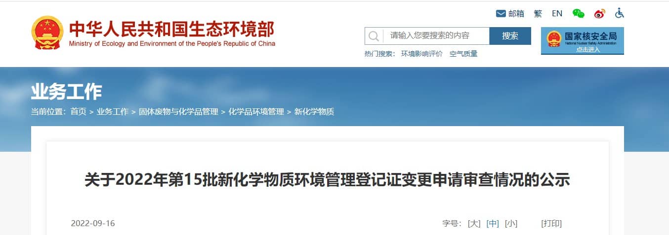 根據《新化學物質環境管理登記辦法》(生態環境部令第12號,以下簡稱《辦法》)、《關于新化學物質環境管理登記有關銜接事項的公告》(生態環境部公告2020年第46號),我部對東洋紡(上海)投資有限公司的59份新化學物質簡易登記證變更申請材料進行了審核,符合有關要求,擬批準登記證變更,詳見附表。