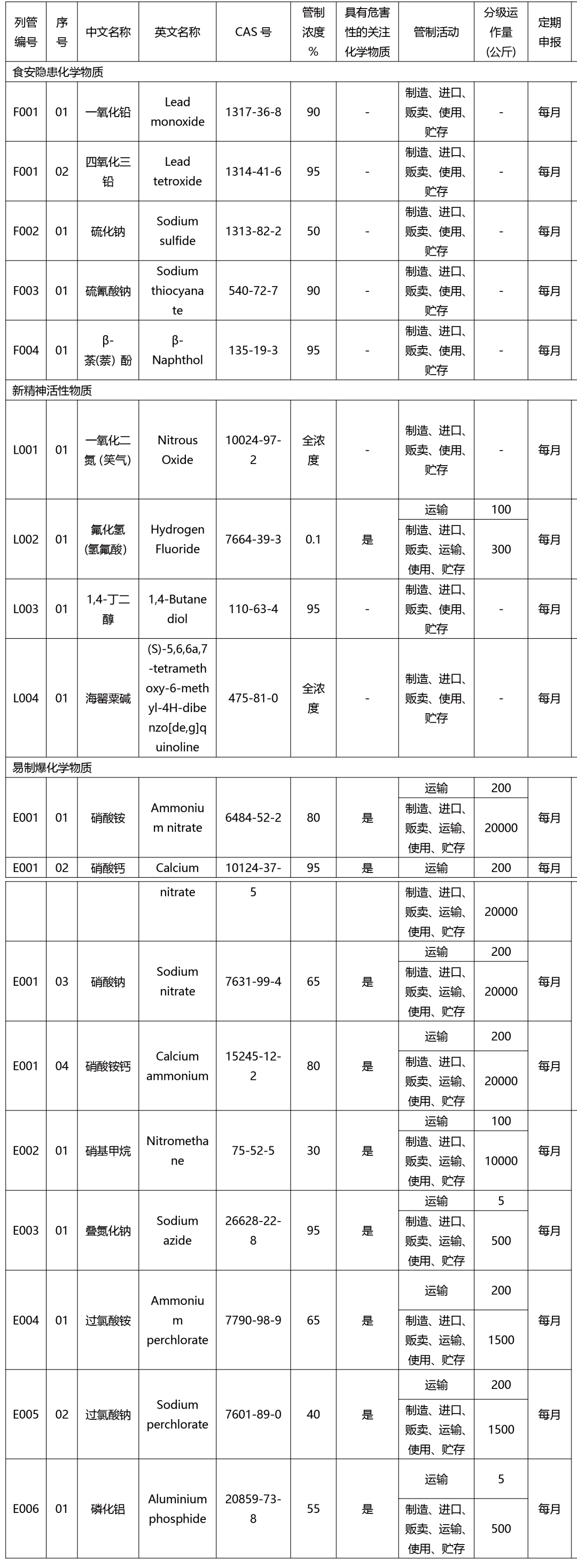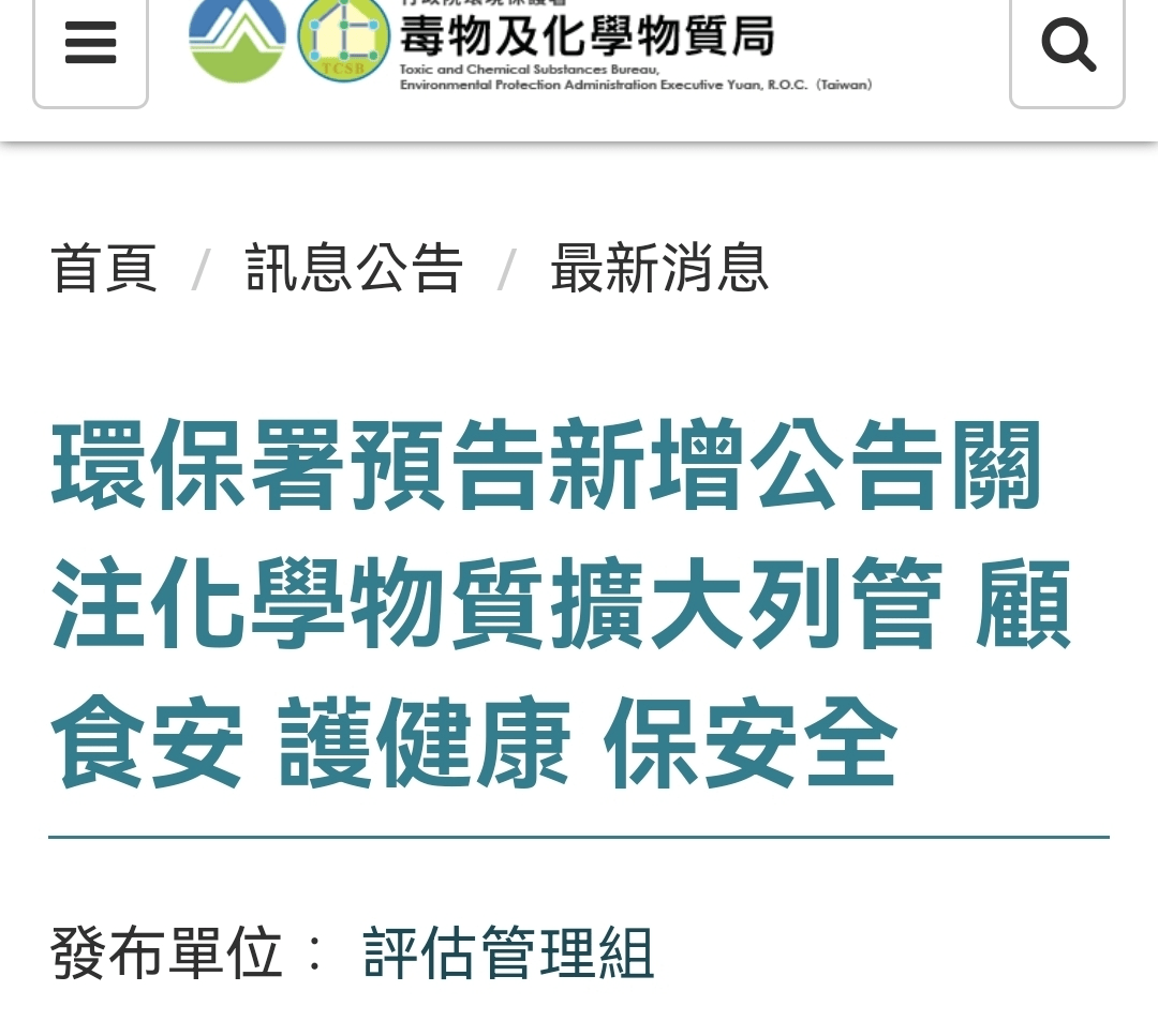 中國臺灣環保局為強化化學物質管理,避免不當使用造成人體健康及環境危害,擬將食安隱患化學物質、新精神活性物質及易制爆化學物質,共3類15種列為關注化學物質。