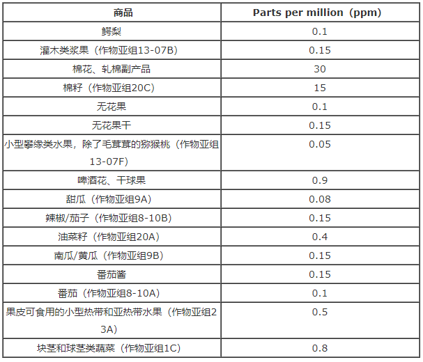 美國環(huán)保署就其毒理性、飲食暴露量以及對嬰幼兒的影響等方面進(jìn)行了風(fēng)險評估,最終得出結(jié)論認(rèn)為,以下殘留限量是安全的。