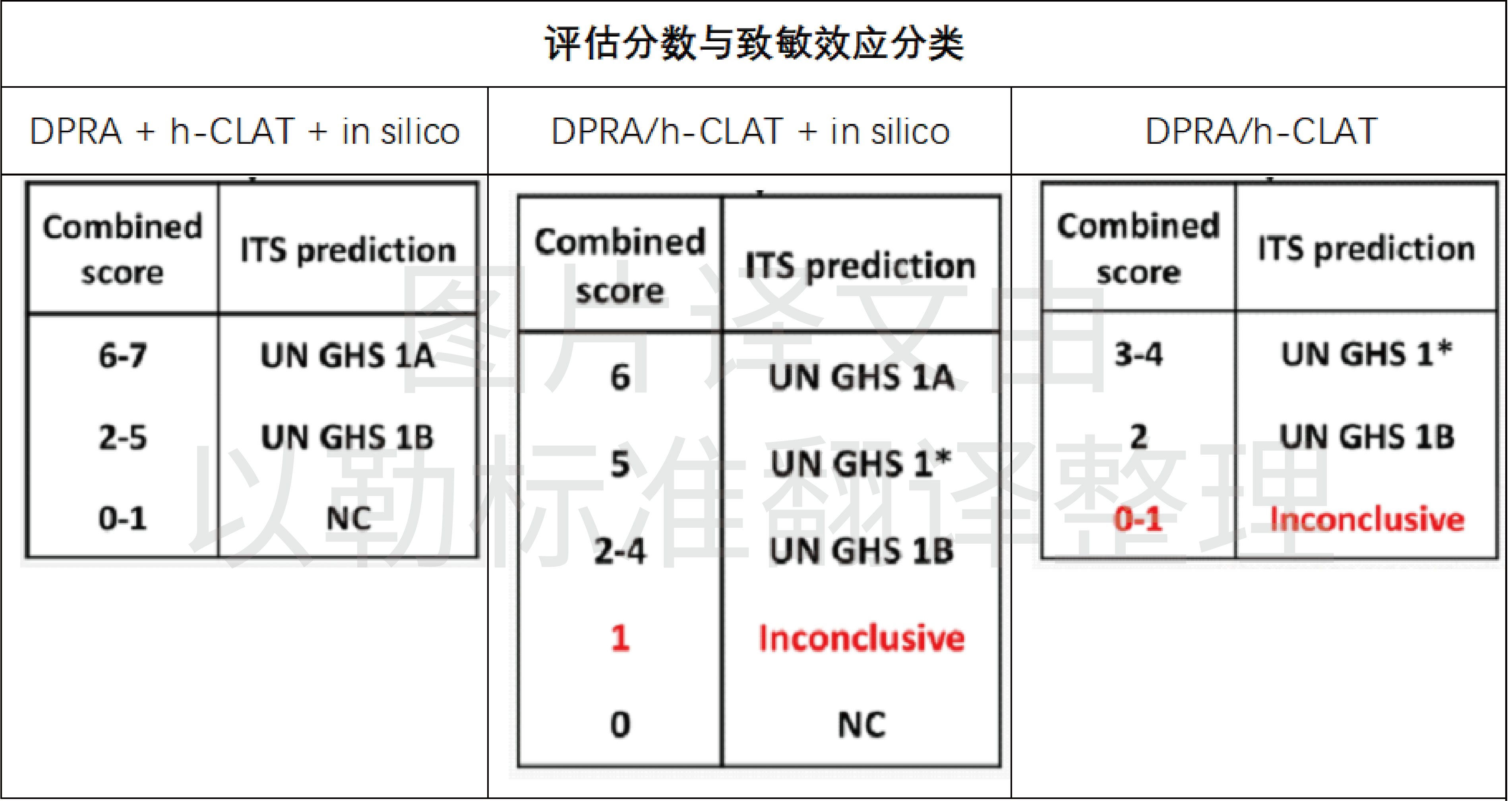 用于評(píng)估皮膚致敏性危害和效力(分GHS 1A、1B和NC,即強(qiáng)致敏性、中等到弱致敏性、無(wú)分類(lèi))。該策略包括導(dǎo)致皮膚過(guò)敏KEs中的KE1和KE3,并包括對(duì)皮膚致敏性的計(jì)算模擬預(yù)測(cè)(in silico)。使用DPRA定量評(píng)估蛋白質(zhì)結(jié)合(KE1),按致敏性強(qiáng)弱評(píng)0-3分;h-CLAT定量評(píng)估樹(shù)突狀細(xì)胞激活(KE3),按致敏性強(qiáng)弱評(píng)0-3分;(Q)SAR軟件Derek Nexus(ITSv1)提供了對(duì)皮膚敏感性的計(jì)算模擬預(yù)測(cè),按有無(wú)致敏性評(píng)0-1分。DPRA或h-CLAT其中一種方法可用時(shí),既可進(jìn)行評(píng)估,三種方法均可用時(shí),評(píng)估結(jié)果最為可靠確切。具體分類(lèi)方法如下: