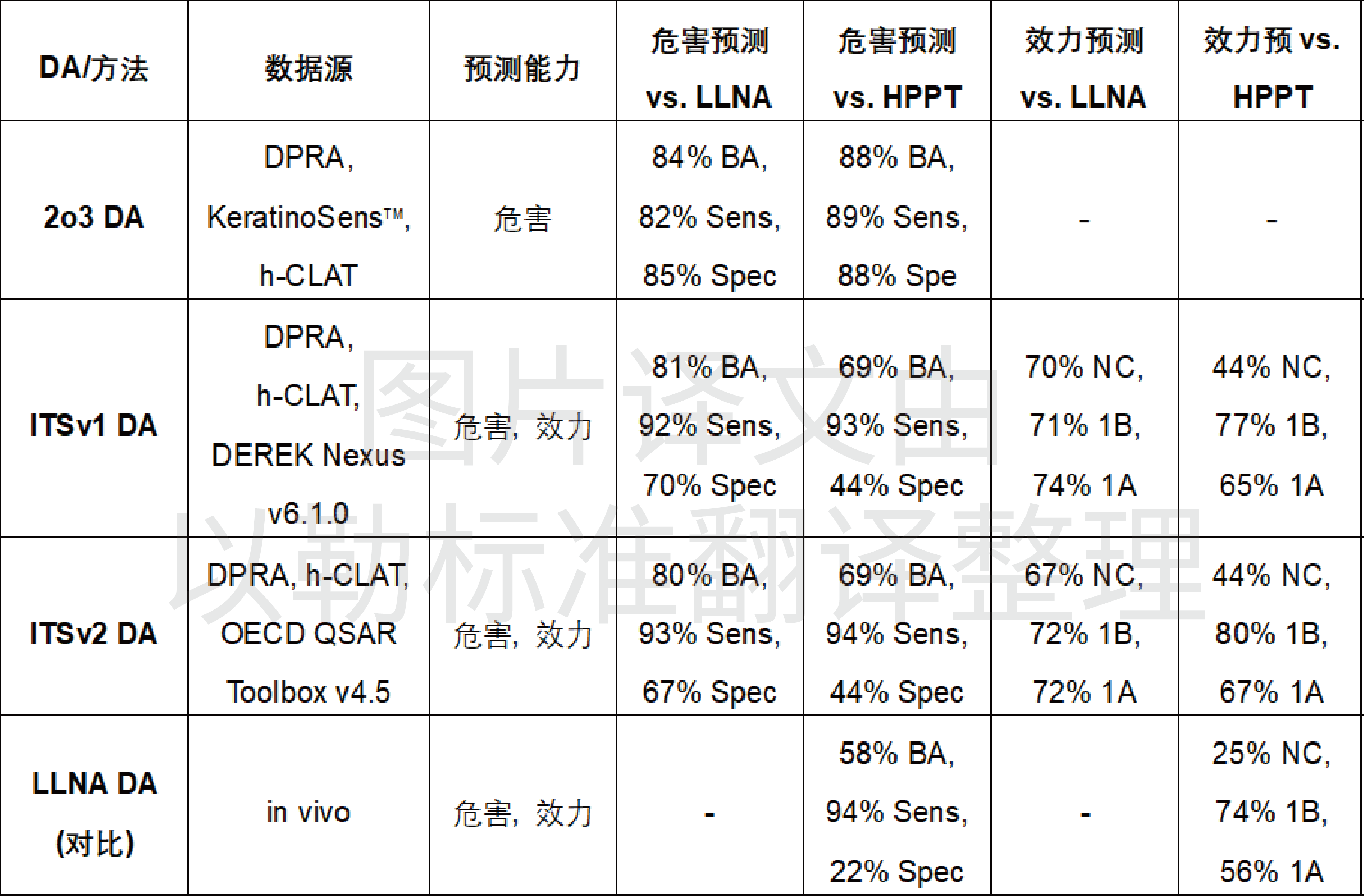 這三種DAs均具有較高的準(zhǔn)確度,在具體使用過(guò)程中,還可通過(guò)結(jié)合實(shí)際物質(zhì)情況選擇合適方法及策略以達(dá)到更高的預(yù)測(cè)準(zhǔn)確度。其中,有些DAs并不適用于金屬、無(wú)機(jī)化合物、UVCB和混合物等物質(zhì)。另外,在采用LLNA數(shù)據(jù)運(yùn)行DPRA 、KeratinoSens?、h-CLAT等DAs預(yù)測(cè)Log P > 3.5類(lèi)物質(zhì)時(shí)靈敏度比較低,而且采用LLNA數(shù)據(jù)相比HPPT數(shù)據(jù)更容易出現(xiàn)假陽(yáng)性結(jié)果,即目前的參考物質(zhì)數(shù)量不足以對(duì)Log P > 3.5的物質(zhì)得出確定度高的結(jié)論。
