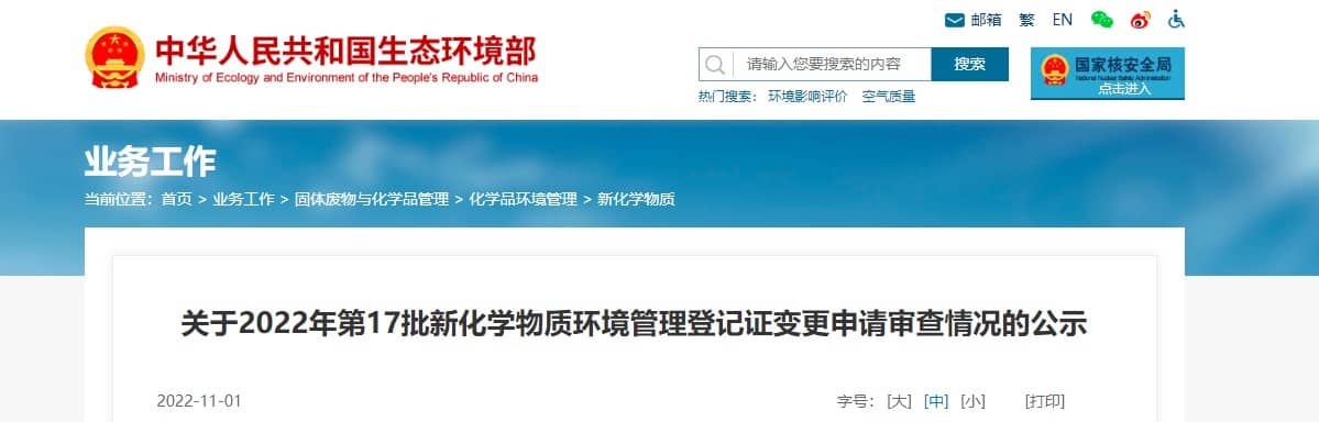 關于2022年第17批新化學物質環境管理登記證變更申請審查情況的公示