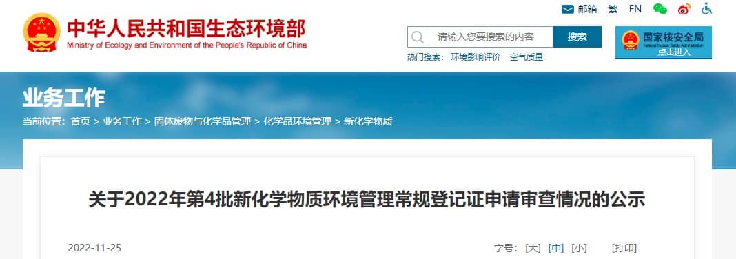 關于2022年第4批新化學物質環境管理常規登記證申請審查情況的公示