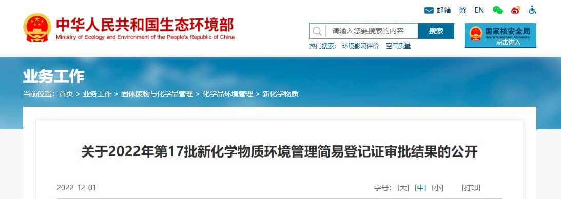 關于2022年第17批新化學物質環境管理簡易登記證審批結果的公開