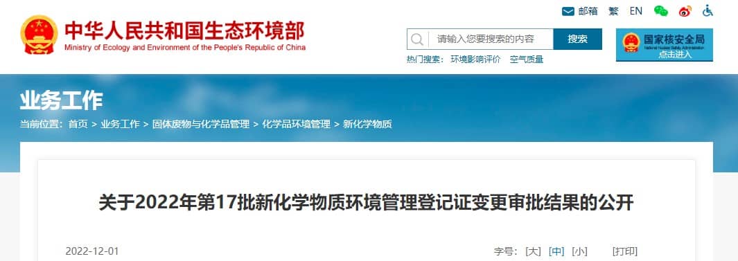 按照《中華人民共和國政府信息公開條例》(國務院令第711號)的要求,現將2022年第17批新化學物質環境管理登記證變更審批結果予以公開。