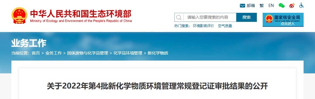 關(guān)于2022年第4批新化學(xué)物質(zhì)環(huán)境管理常規(guī)登記證審批結(jié)果的公開