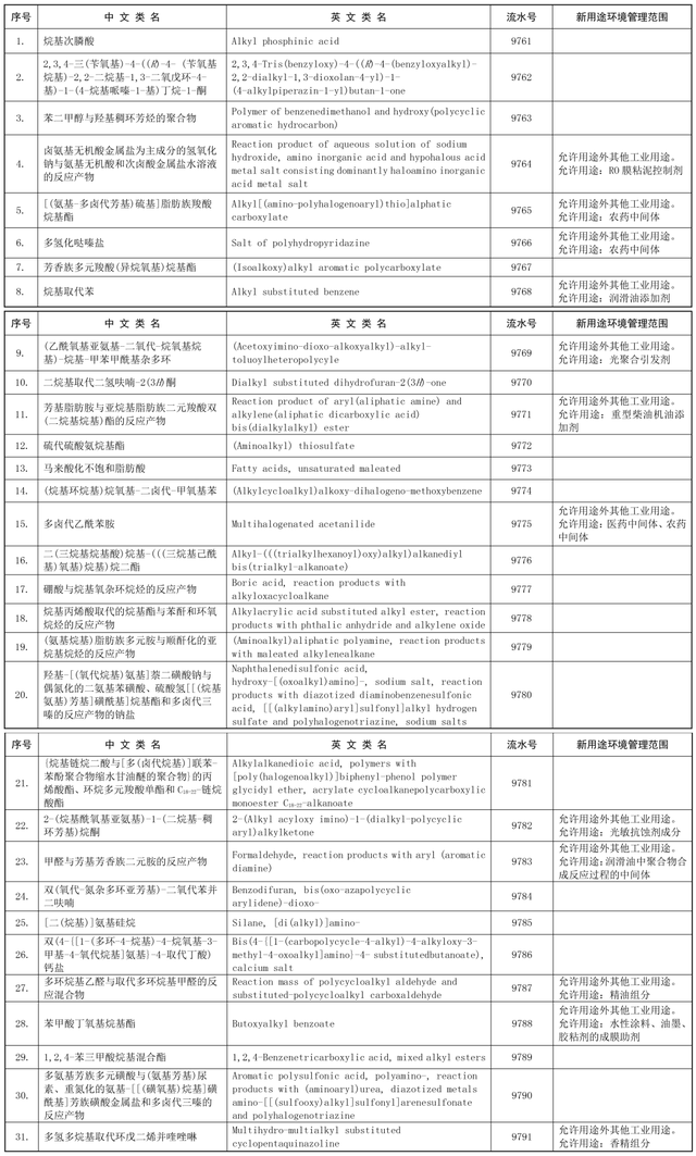 包括用于水性涂料、油墨、膠粘劑的成膜助劑苯甲酸丁氧基烷基酯、用于潤滑油中聚合物合成反應過程的中間體甲醛與芳基芳香族二元胺的反應產物等36種物質。