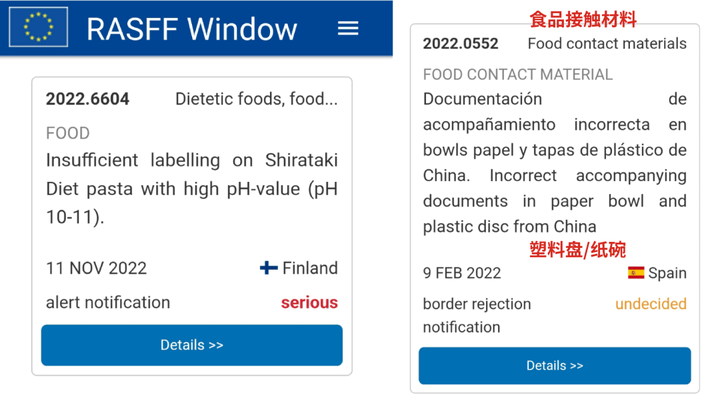 在2022年第48周通報中,歐盟食品和飼料類快速預警系統(RASFF)通報中國食品及相關產品有8例,下圖選取其中4個案例。涉及出口德國、波蘭、西班牙等國,通報原因有初級芳香胺遷移、甲醛遷移等。